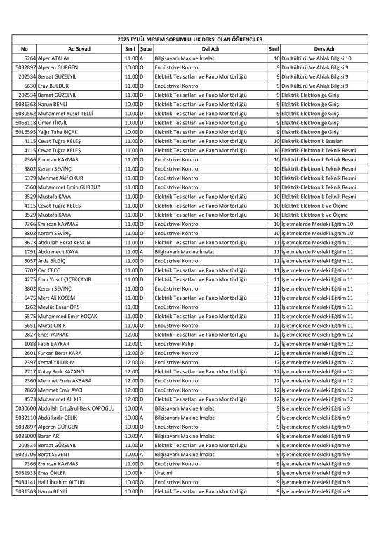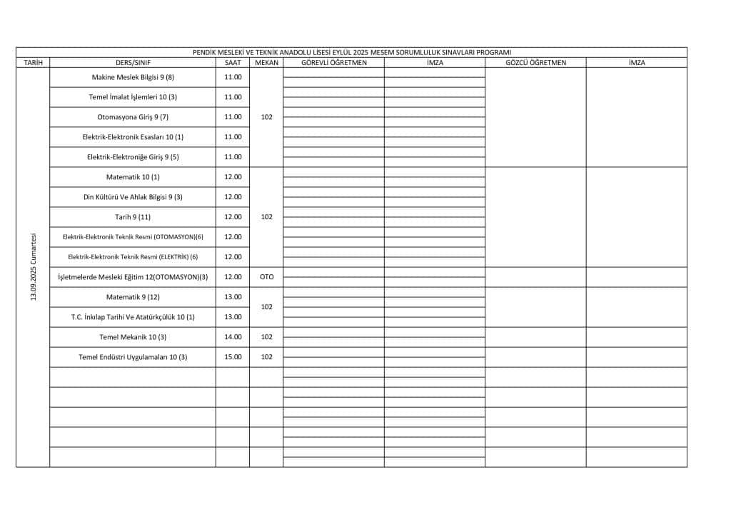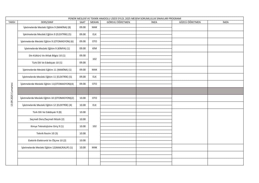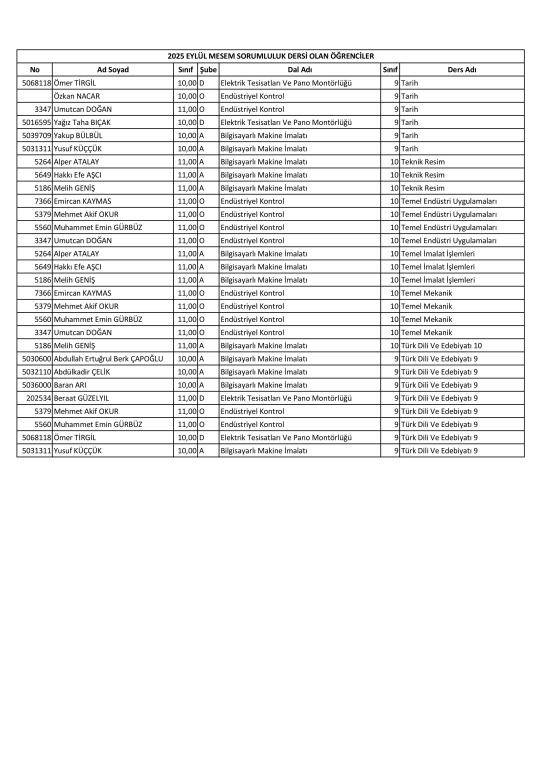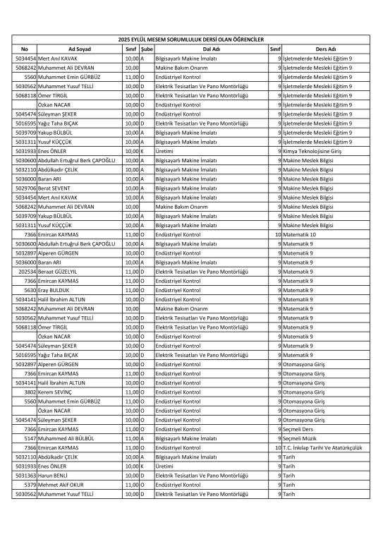 MESEM Sorumluluk sınavları 13.09.2025 Tarihinde yapılacaktır. Sorumluluk dersi olan öğrenciler ve sınav takvimi aşağıda paylaşılmıştır.